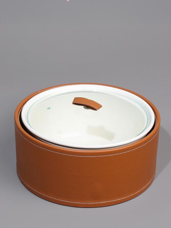 Porcelain and brown leather utensils: Round Size: 10