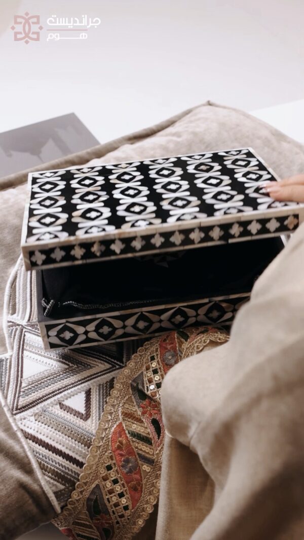 نقصة : – سجادة صلاة إسفنجية من تصميمنا – صندوق من الخشب والصدف -حقيبة من المخمل من تصميمنا – قرآن كريم مجزء